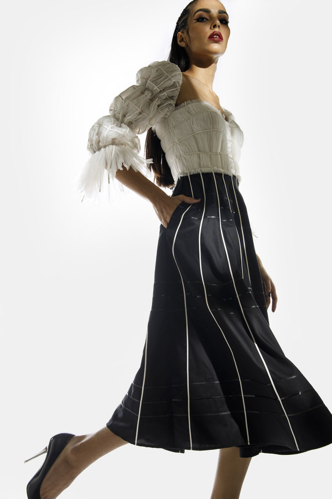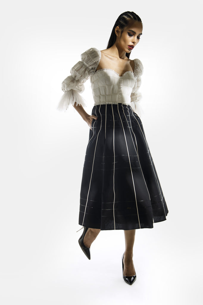 Featuring A- Line dress with trap sleeves with panelled puffs, a tonic bustier and a charcoal skirt with faux leather geometric applique.