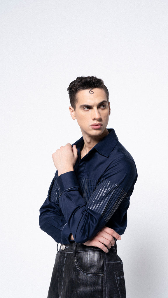 Introducing "The Something Blue" – a timeless, full-sleeve shirt crafted from high-quality blue cotton. This shirt features a unique blue matte faux leather brick pattern that adorns both the front panels and sleeves, adding a touch of sophistication and individuality. With its stylish design, it is the perfect choice for impressing your date and making a lasting impression.