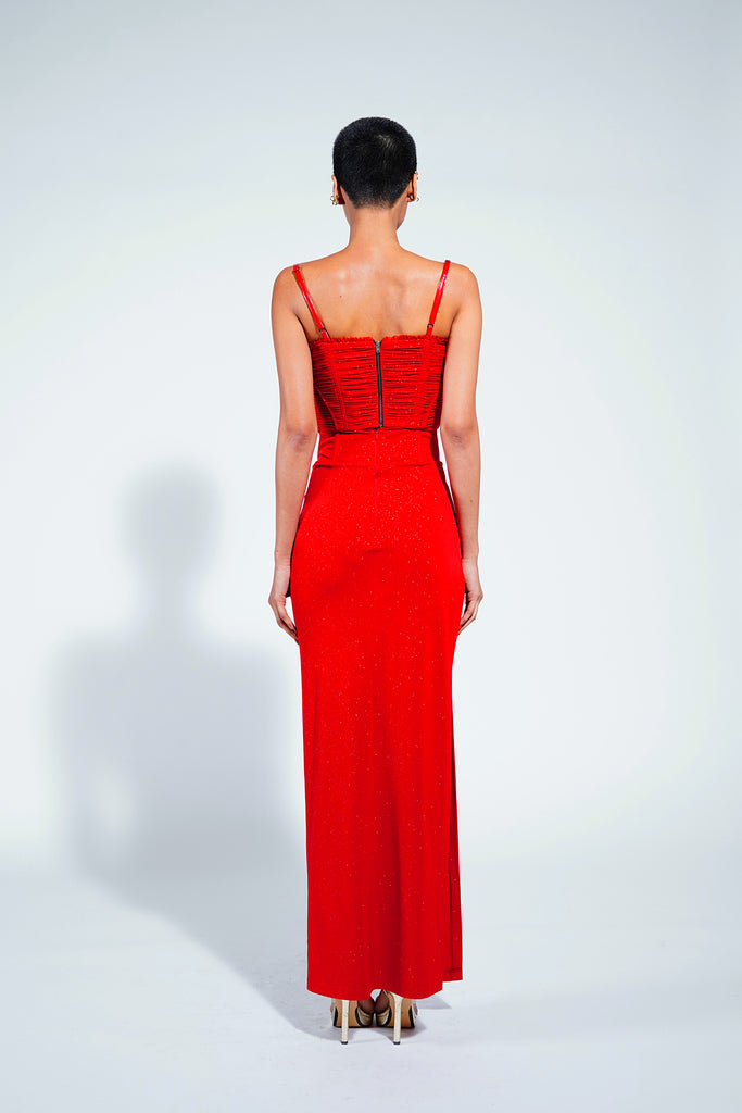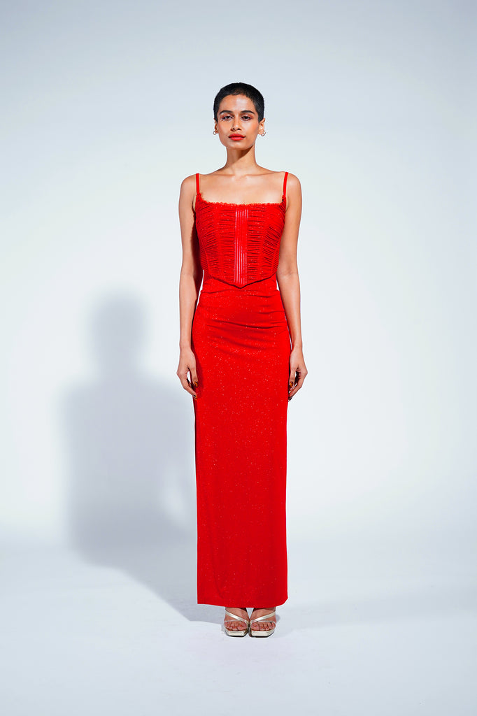 Featuring a heavily textured corset with ruching and jersey pintucks on the side panels to accentuate the shape and fit with organza ruffle trim details at the neckline.