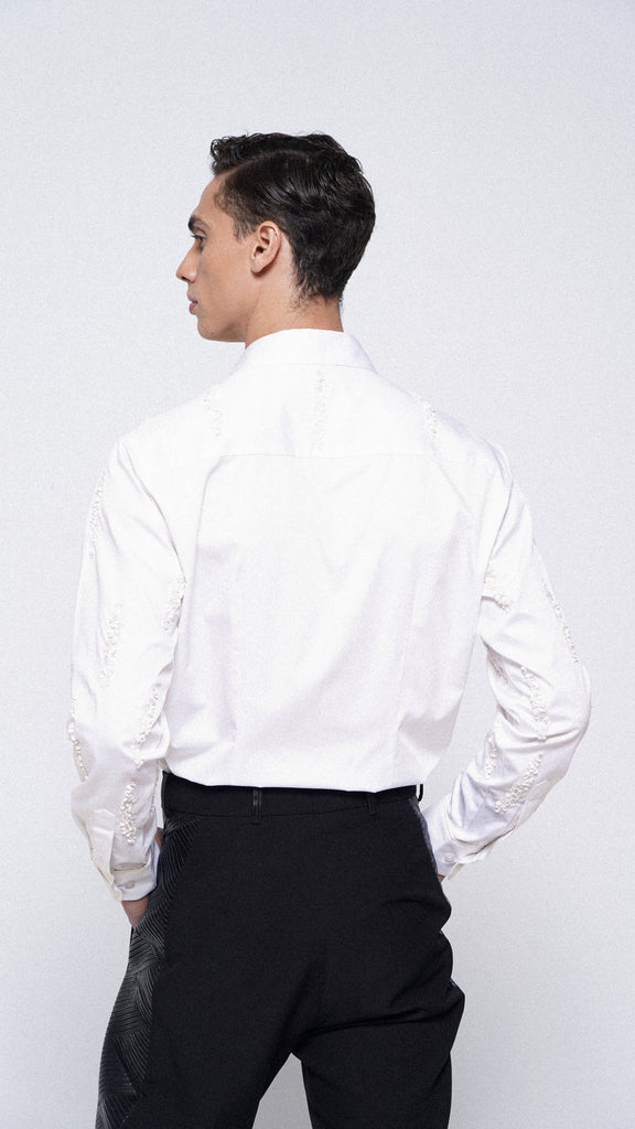Introducing the stunning "White Cosmo" shirt, a timeless classic crafted from premium white cotton. This elegant full-sleeve shirt features meticulously hand-embroidered sequin motifs, adding a touch of sparkle and sophistication. The exquisitely detailed design makes it an ideal choice for special occasions and events, ensuring you stand out with effortless style and grace.