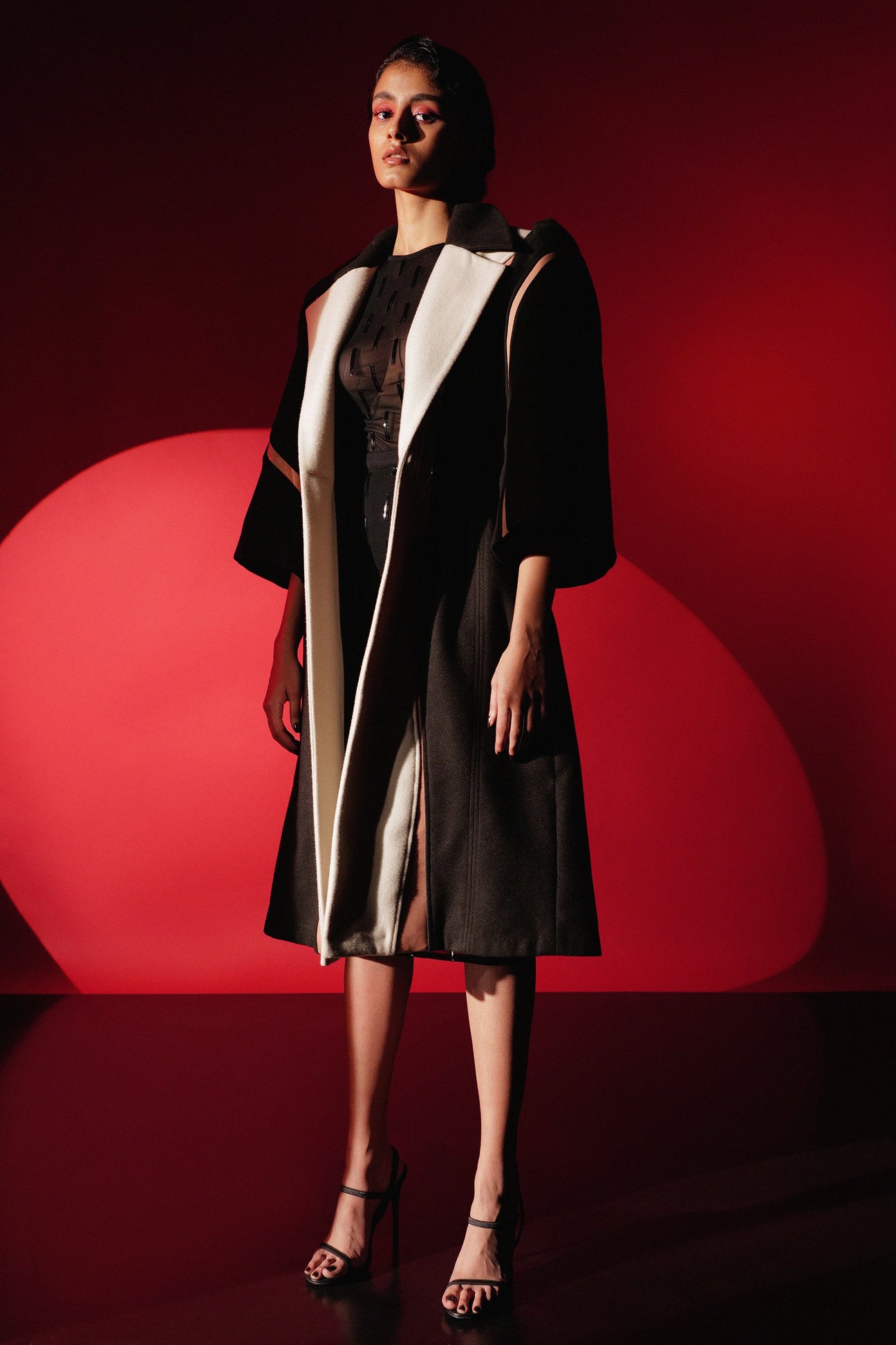 Featuring a Monalisa and Eve contrasted over-coat with puff sleeves and accent pink faux-leather asymmetrical inserts on the body and sleeves.